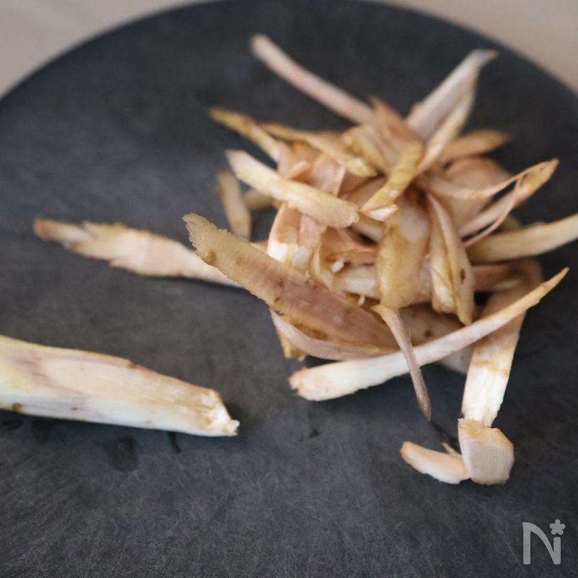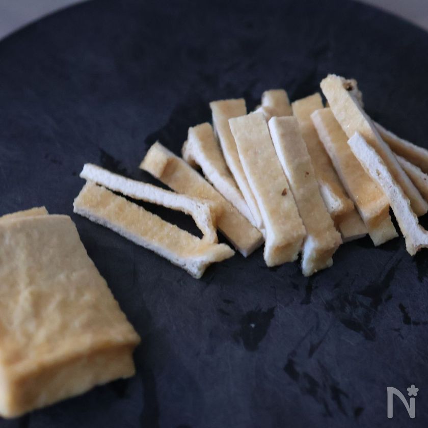 (2) 熱湯をまわしかけて軽く水分を絞った油揚げを短冊切りにする。