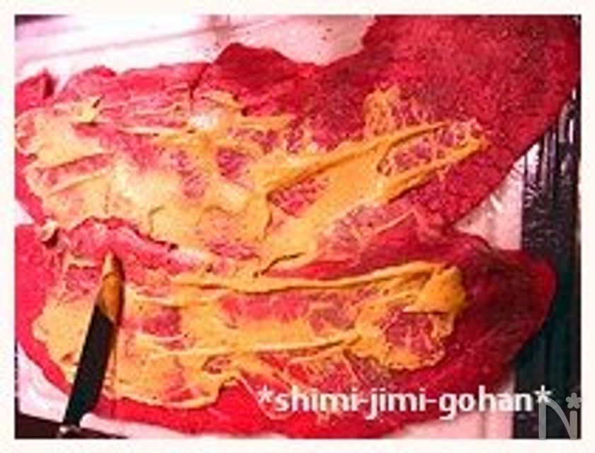 (2) 牛肉を広げ、塩・胡椒したら、マスタードを塗り広げる。