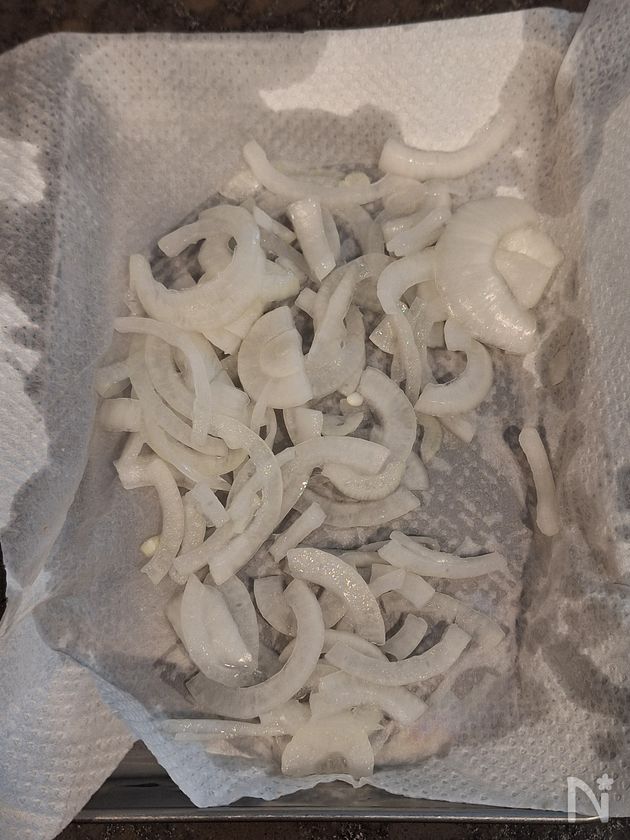 (2) 新たまねぎから水けが出たら洗ってしっかり水気をふきとる。