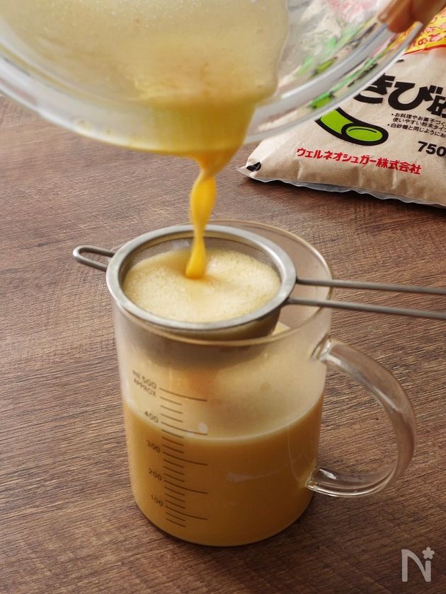 (1) 全卵をボウルに入れ溶きほぐし、きび砂糖を加えてよく擦り混ぜる。