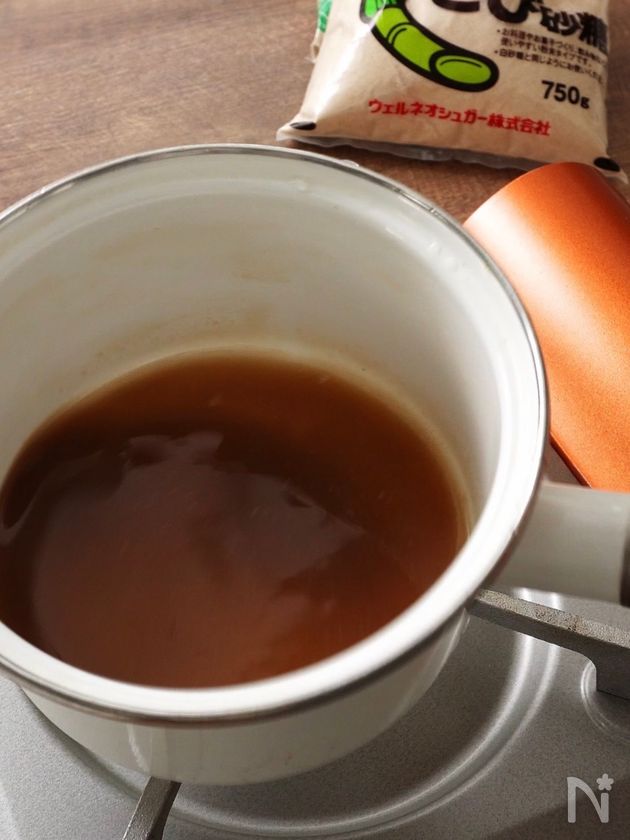 【A】の水ときび砂糖を鍋に入れて中火で加熱し、鍋をゆすりながらなじませる。