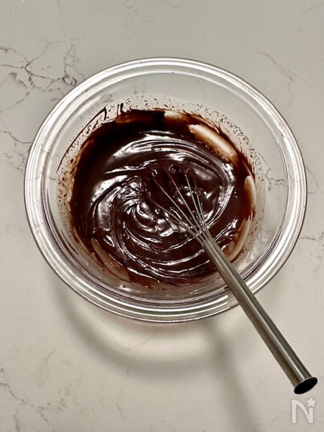 (1) 耐熱ボウルに板チョコレートを割り入れ、生クリーム50㎖を加えてラップをし、電子レンジ(600W)で1分加熱して混ぜ合わせる。