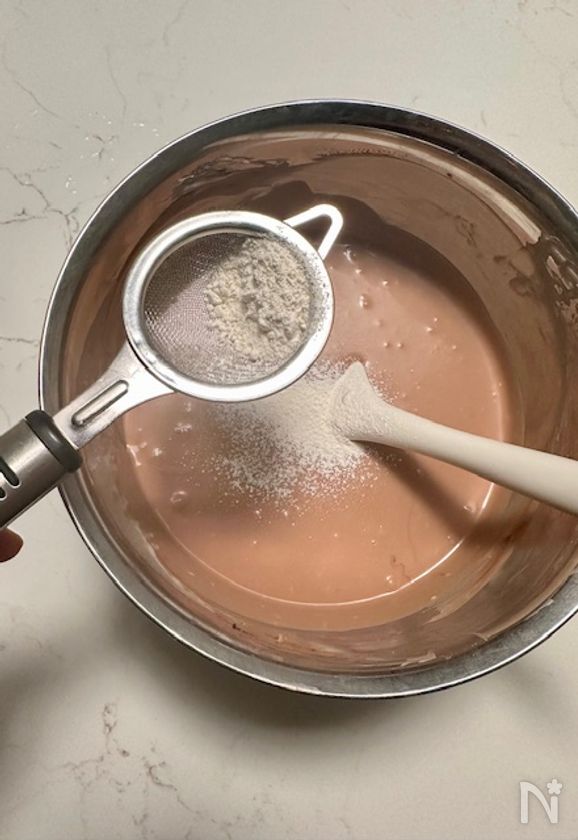 (5) 薄力粉を茶こしでふるい入れて、ゴムべらで軽く混ぜ合わせ、型に流し入れる。(ザルで漉して型に入れるとさらに滑らかに仕上がります)