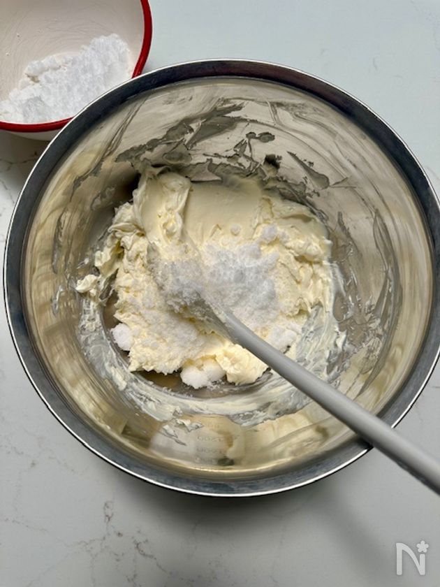 (2) クリームチーズをボウルに入れてゴムべらでなめらかに混ぜ、砂糖を2回に分けて加えてすり混ぜる。