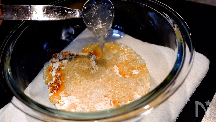 工程5)炭酸水を加えることで、衣がカリッと仕上がります。なければ水でOK。激しく混ぜすぎるとグルテンが出てベチャッとした衣になってしまうので注意!