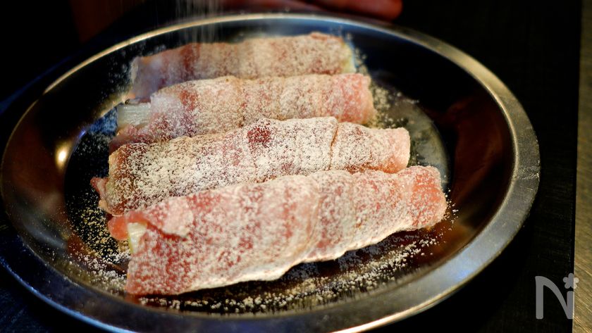 (2) 豚バラ肉薄切りを広げ、塩・こしょうで下味をつける。長ねぎを手前におき、豚肉をくるくると巻きつける。巻き終わりに薄力粉をぬる。