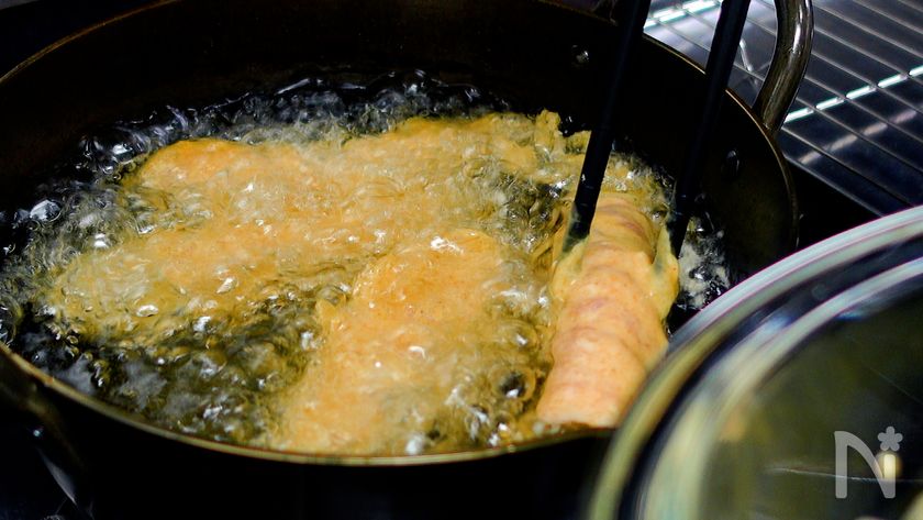 (6) 豚巻きを衣にくぐらせ、170℃の揚げ油で4~5分揚げる。揚げたら取り出し油を切る。