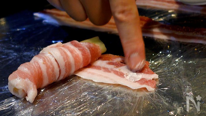 工程2)豚肉を少し斜めにすると巻きやすいです。