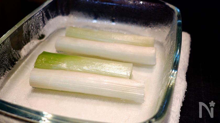 (1) 長ねぎは4等分に切る。耐熱皿に入れラップをし、電子レンジで加熱し柔らかくする。