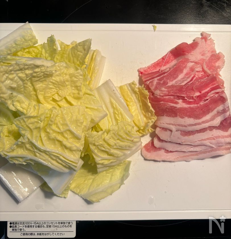 (1) 豚バラ薄切り肉は食べやすい大きさに切る。