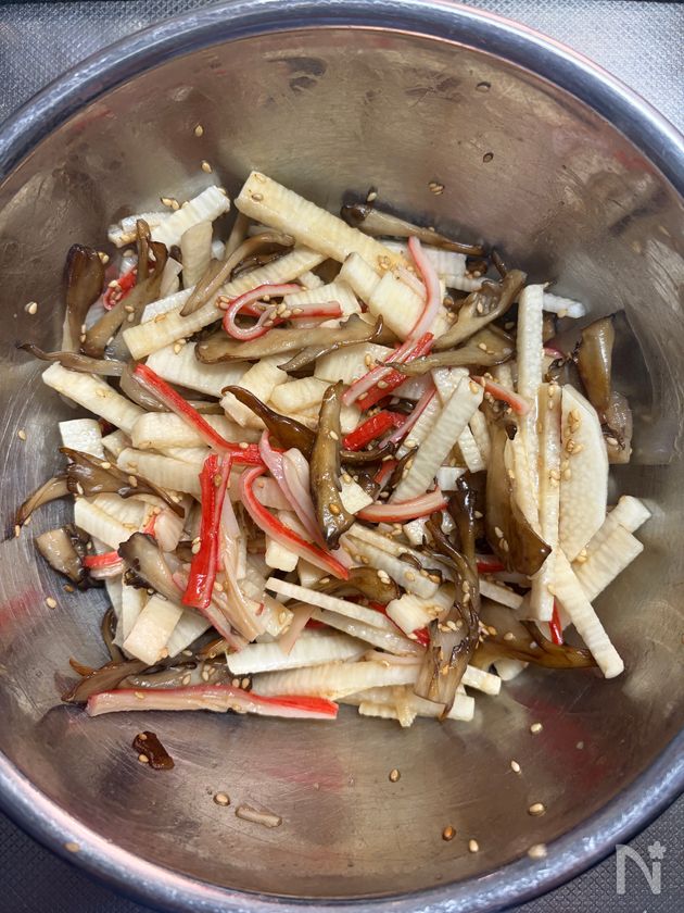 長芋・焼いた舞茸・カニカマ加えて和える。