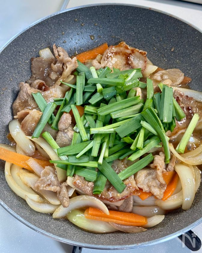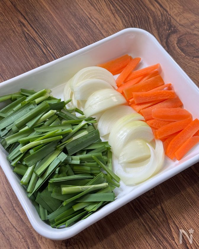 ・玉ねぎ、にんじんは薄切りにする。にらは4cm長さに切る。