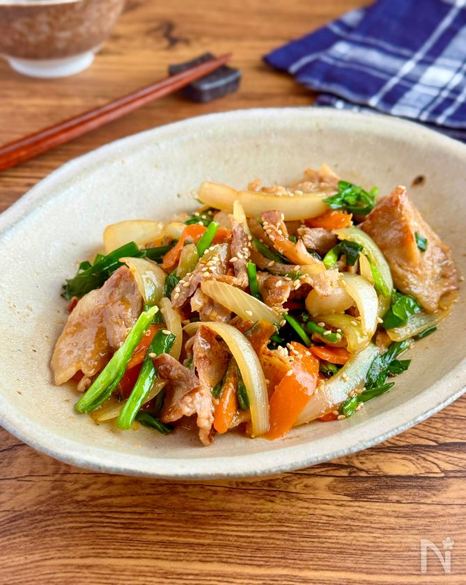 さっと作れる【豚こまと野菜の味噌しょうが炒め】