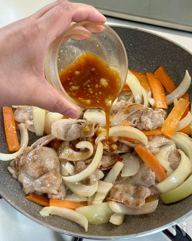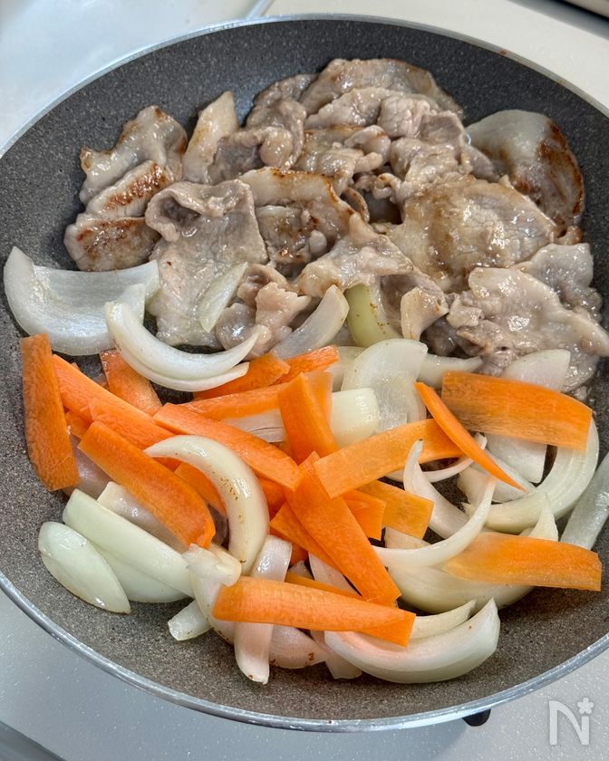 (2) 豚肉の色が変わったら、玉ねぎ、にんじんを加えて炒める。