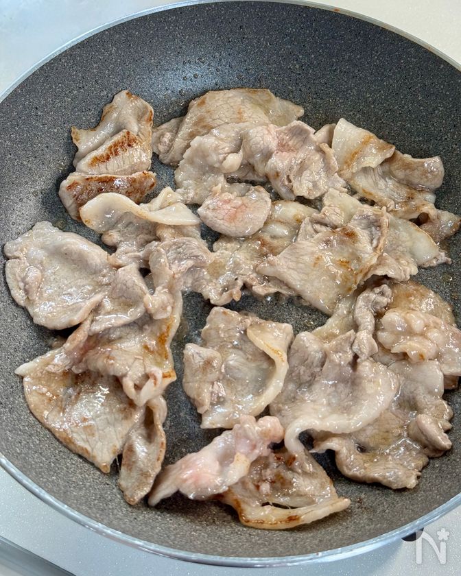 (1) フライパンに米油を中火で熱し、酒と片栗粉を揉みこんだ豚こま切れ肉を入れ、ほぐしながら炒める。