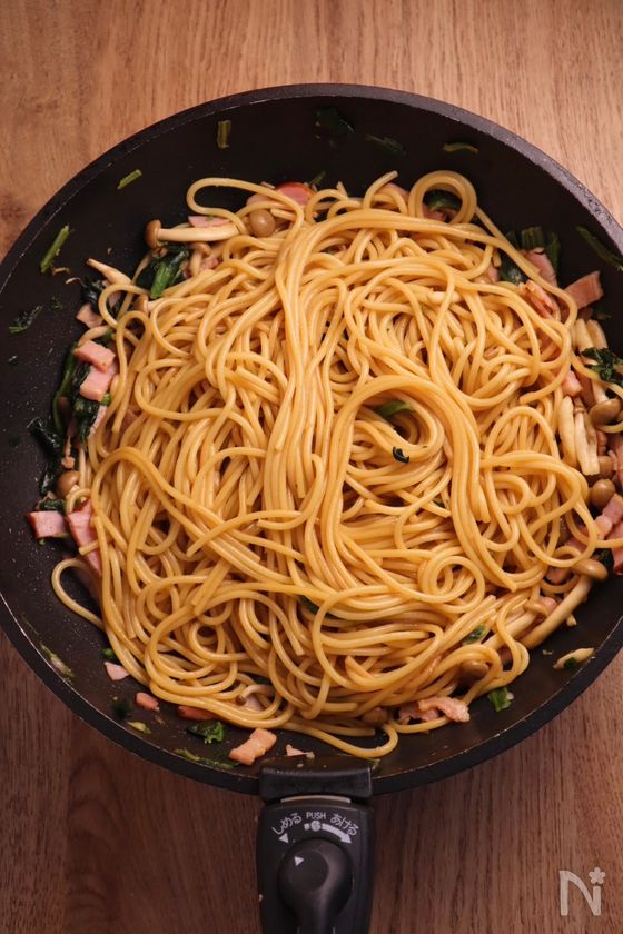 パスタと調味料を入れたら、しっかり混ぜ合わせると味が均一に馴染みます。