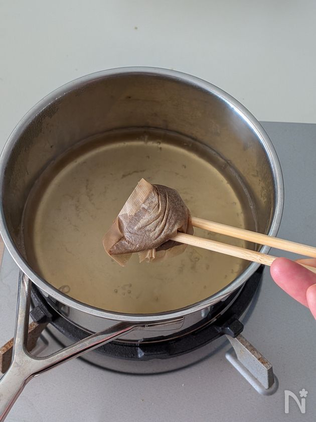(1) 鍋に水と無塩のだしパックを入れ、中火で加熱し、沸騰したら弱火で3〜4分煮出して取り出す。
