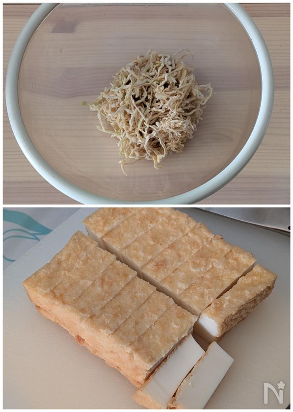 (下準備) 切り干し大根は水でもみ洗いして水気をきる。