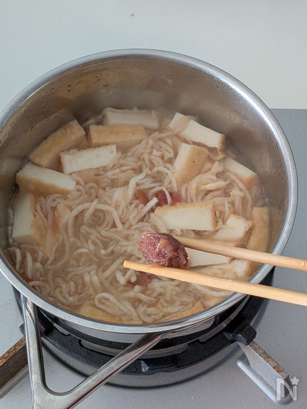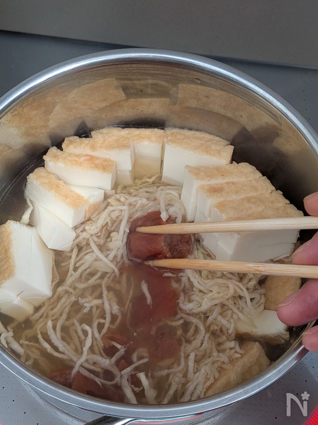 (2) 切り干し大根、絹厚揚げ、しそ梅を入れて、梅を箸などで崩しながら2〜3分煮る。