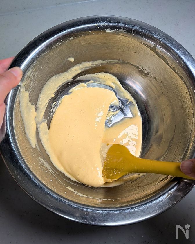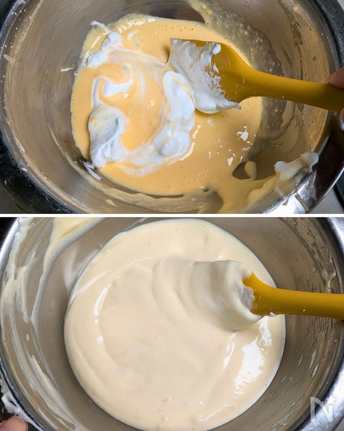 ・卵黄生地に最初に加えるメレンゲはしっかり混ぜることで、生地がなじみやすくなります
