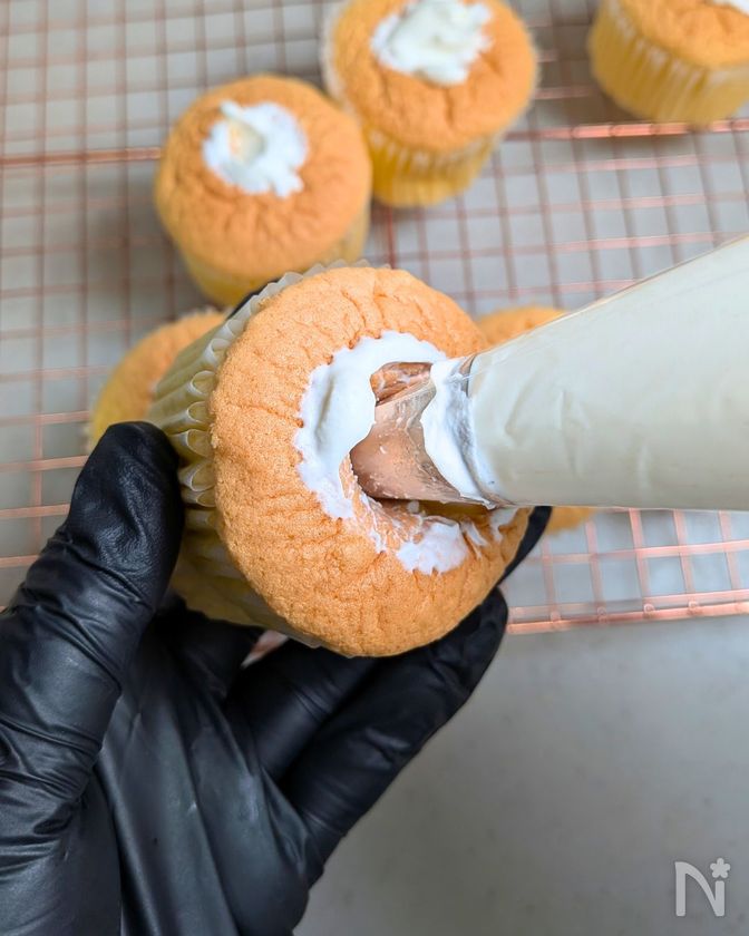 ・クリームの注入のし過ぎはシフォンケーキの割れになります。注意しながら詰めましょう。