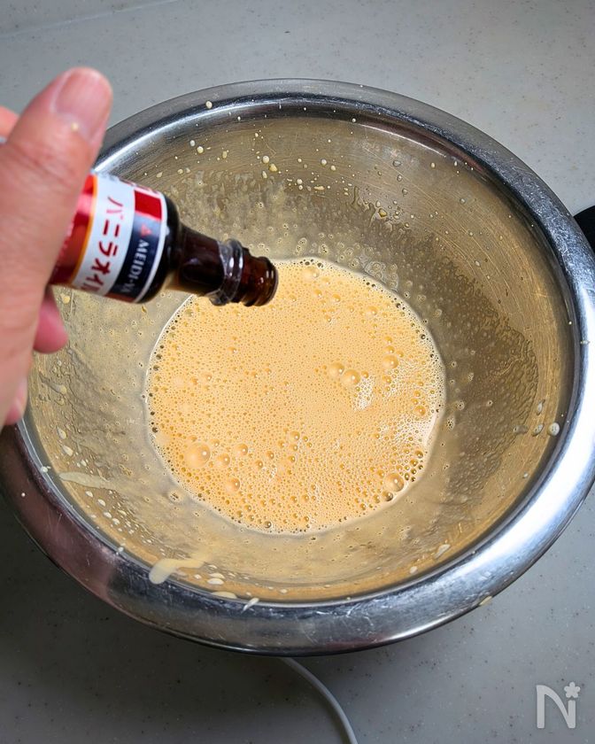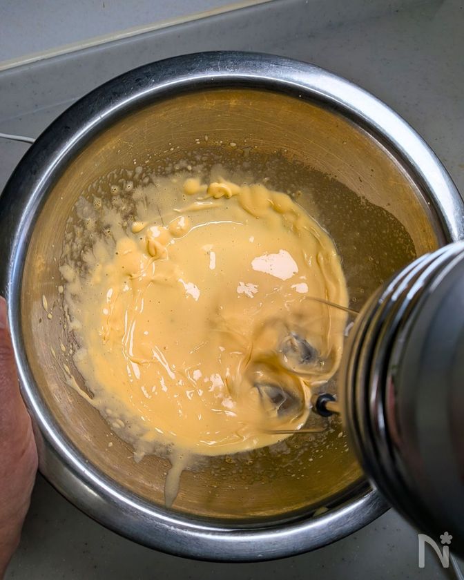 (2) サラダ油・牛乳・バニラオイルの順に加えて、その都度よくハンドミキサーで混ぜる。