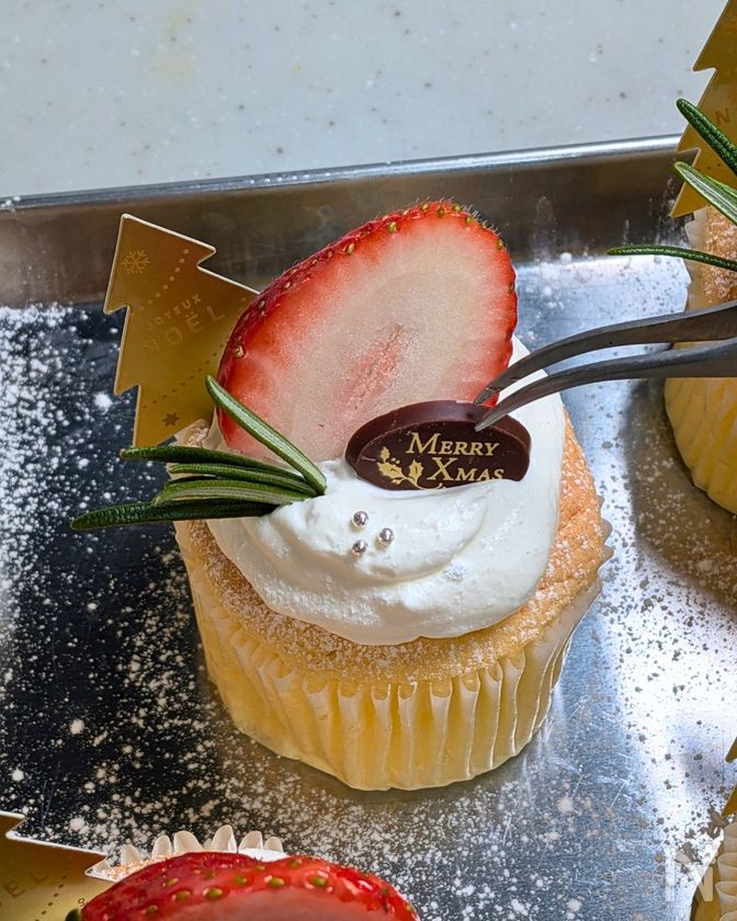 いちご・ローズマリー・デコレーション用チョコレート・アラザンを飾る。