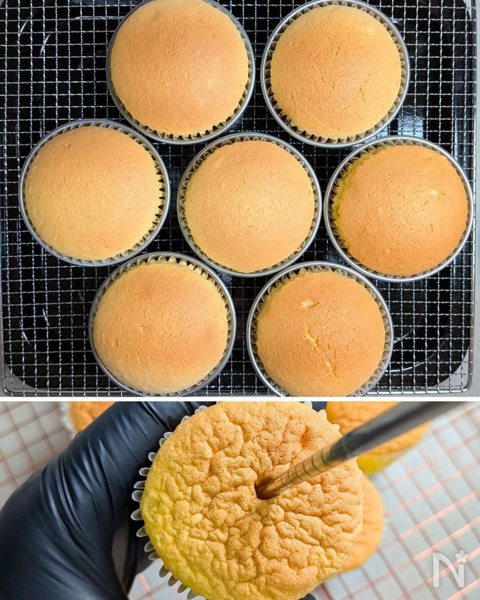 (7) 焼きあがったらすぐに型から取り出して網の上で冷まし、菜ばしを刺して前後左右に動かし穴を空ける。