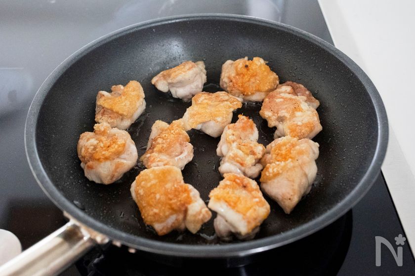 (2) フライパンにサラダ油(大さじ1/2)を中火で熱し、鶏肉の皮目を下にして並べる。焼き色がついてきたら、蓋をして弱火にし、蒸し焼きにする。肉の表面が白に近い薄ピンク色になってきたら、裏返してすぐに取り出す。