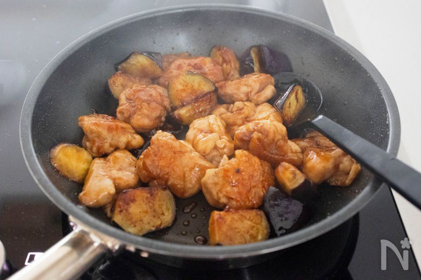 ☑︎なすは、鶏肉から出た脂にサラダ油を足して焼きます。脂(油)が多い場合は、なすを焼いた後に拭き取ってください。