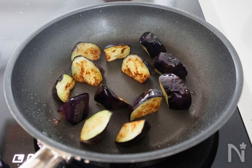 (3) 2のフライパンにサラダ油(大さじ1)を足して中火で熱し、水気を切ったなすの皮を下にして並べて2分焼く。さらに、面を返して焼き色をつける。