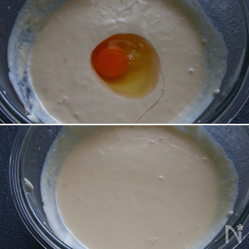 (3) 卵を1つずつ加えそのつど泡立て器でよく混ぜ合わせる。