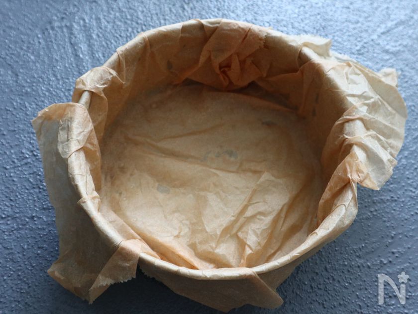・30cm幅のクッキングシートを30cmで切り、くしゃくしゃにしてから水に濡らし、広げて型にぴったりとそわせて敷く。