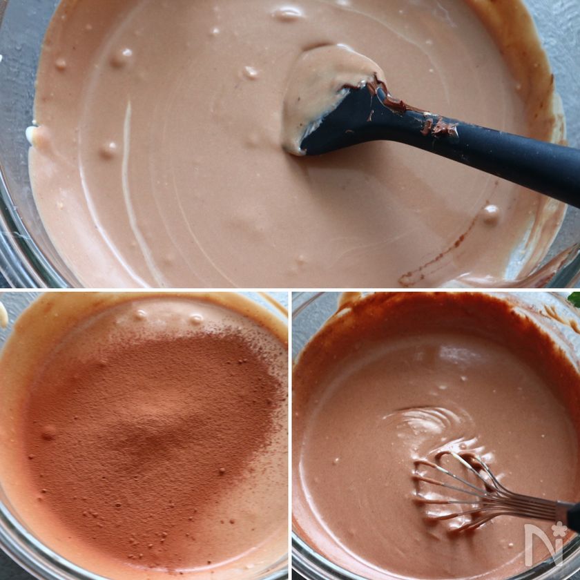 (5) 3に4を流し入れ、ゴムベラでよく混ぜ合わせる。ココアパウダーをふるい入れ、泡立て器でよく混ぜ合わせる。