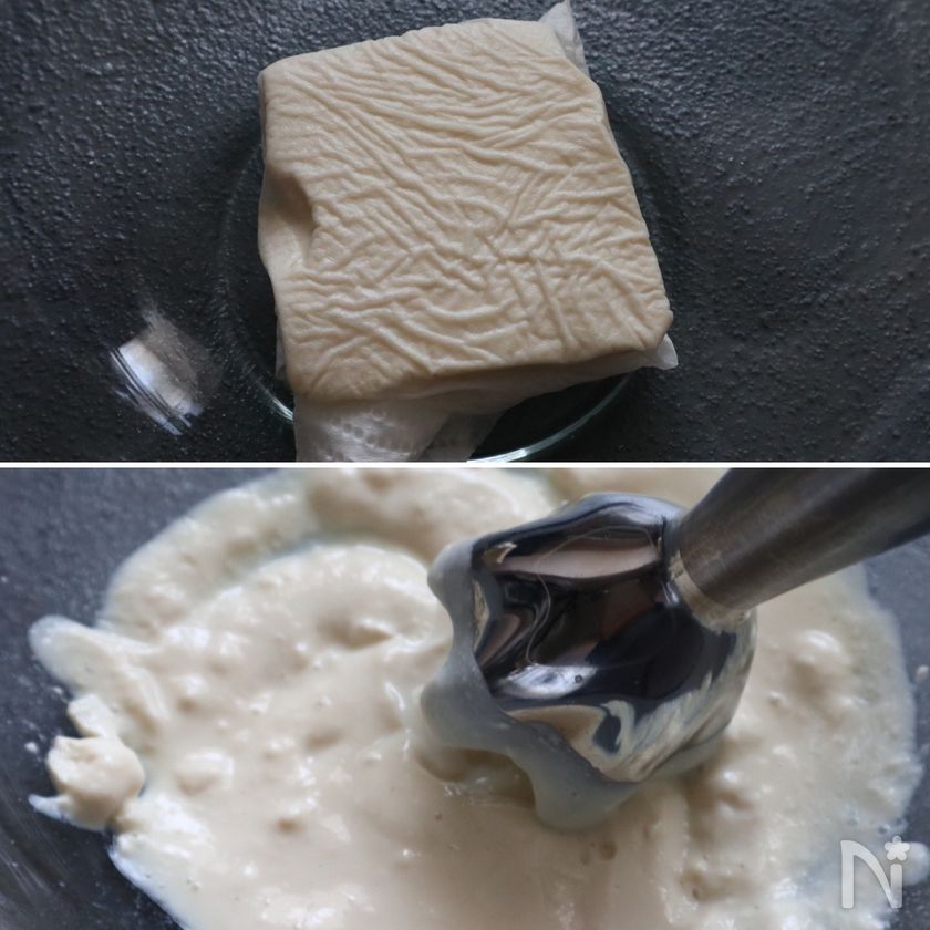 (1) 絹ごし豆腐をペーパータオルで包み大きめの耐熱ボウルに入れ電子レンジで1分加熱。ペーパータオルから出し、ハンドブレンダーでなめらかになるまで撹拌する。
