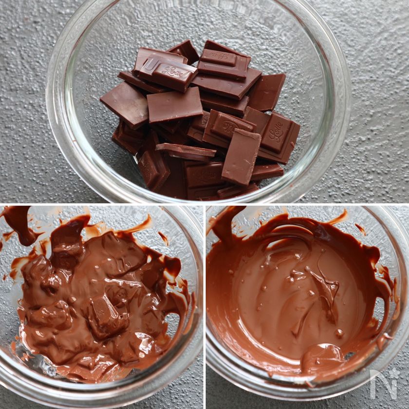 (4) 小さめのボウルに板チョコレートを割り入れ、電子レンジで1分30秒加熱。ゴムベラで上下を返し、さらに電子レンジで30秒加熱混ぜ合わせるを繰りかえしなめらかに溶かす。