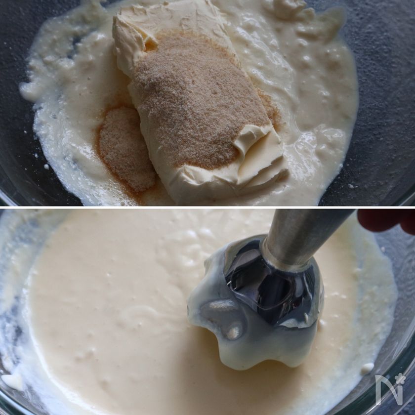 (2) クリームチーズを加え、電子レンジで30秒加熱。きび糖を加え、ハンドブレンダーまたは泡立て器でなめらかになるまで混ぜる。