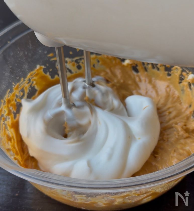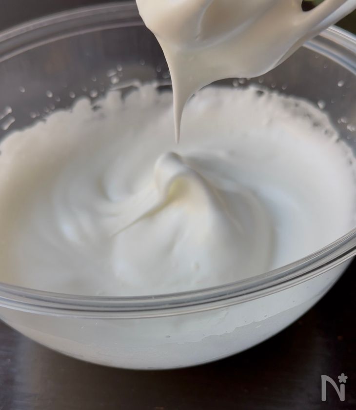 卵白の泡立ては緩くお辞儀する程度です。立てすぎないように気をつけてください。