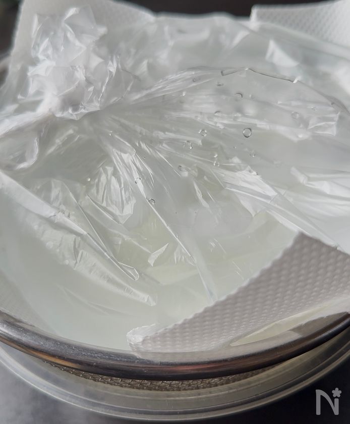 (下準備) ザルの上にキッチンペーパー2枚を敷き、無糖ヨーグルトをいれ更に上にキッチンペーパー1枚を被せる。氷水の入ったポリ袋を上に置き、15分程度置いておく。