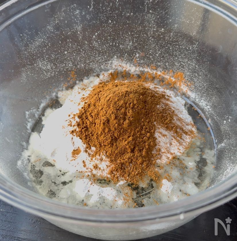 (1) ボウルにサラダ油をいれ電子レンジ(600W)1分加熱する。加熱後、米粉とシナモンパウダーを加え混ぜる。