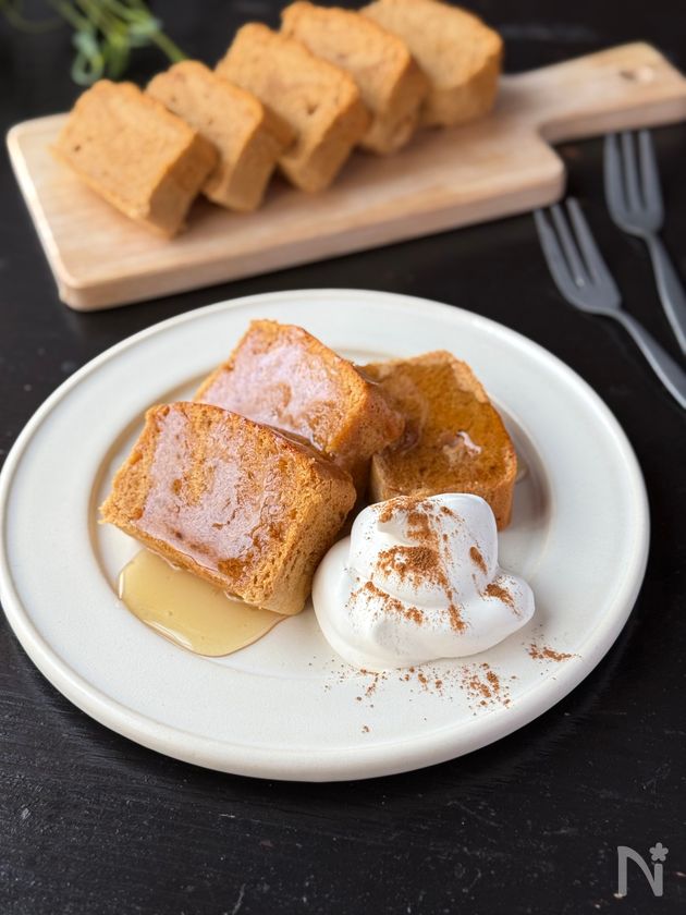 (11) お好みの大きさに切りわけ、ホイップクリームやシナモンパウダーを添え、蜂蜜をかける。