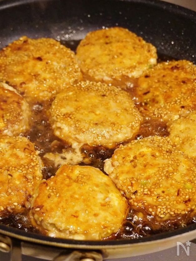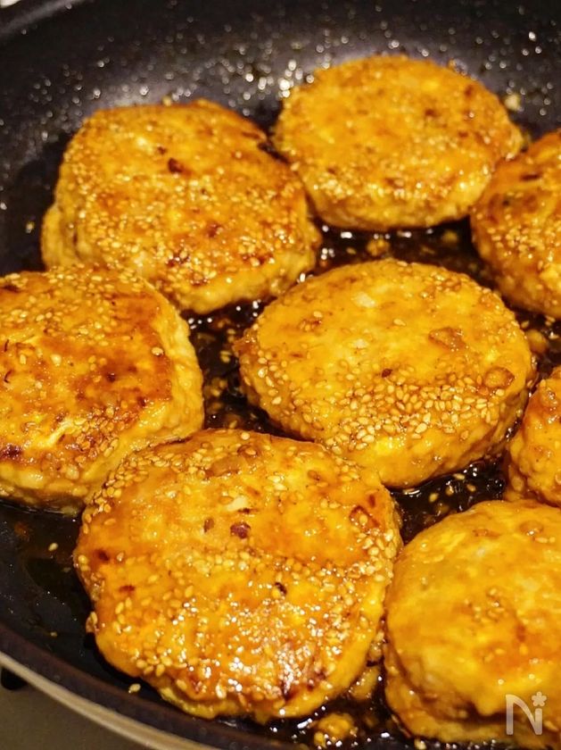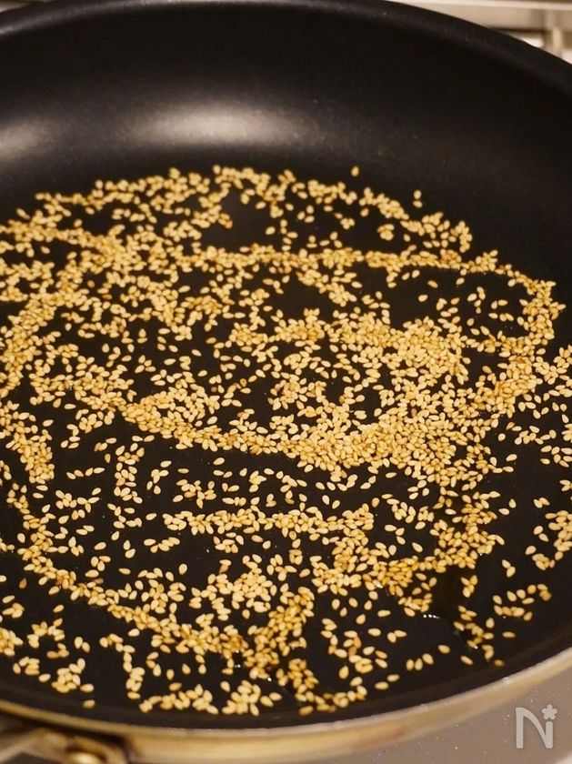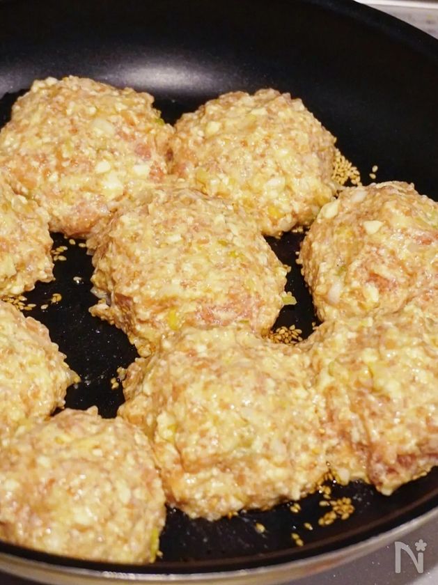 ・ごまをフライパンに散らしてから焼くことでつくねの表面にたっぷりとごまがつきます&香ばしいごまの香りを楽しめます◎