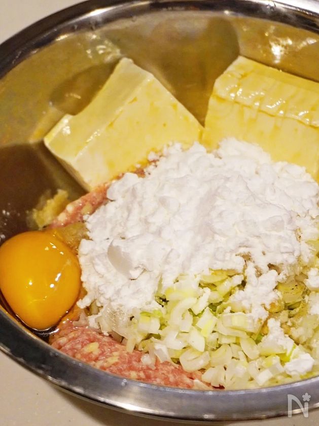 (1) 【A】をボウルに入れ粘り気が出るまでよく混ぜ合わせ、9等分し丸く成形する。