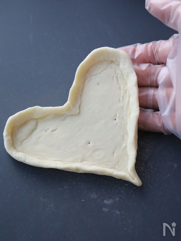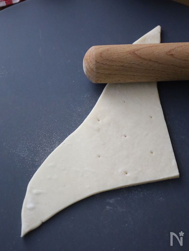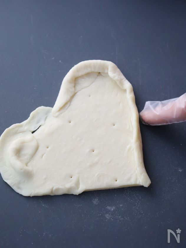 (6) フォークで穴を開けてピケし、フチ部分は艶出しの溶き卵を塗る。