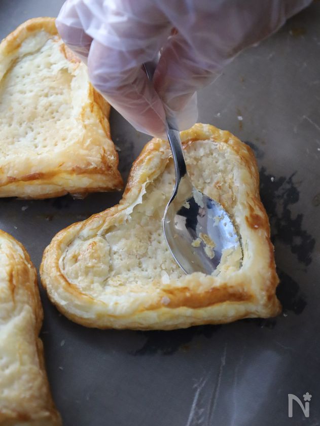 (7) 200度のオーブンで15〜20分ほど焼成したら、膨らんだ中央部分をスプーンで押し潰して凹ませる。