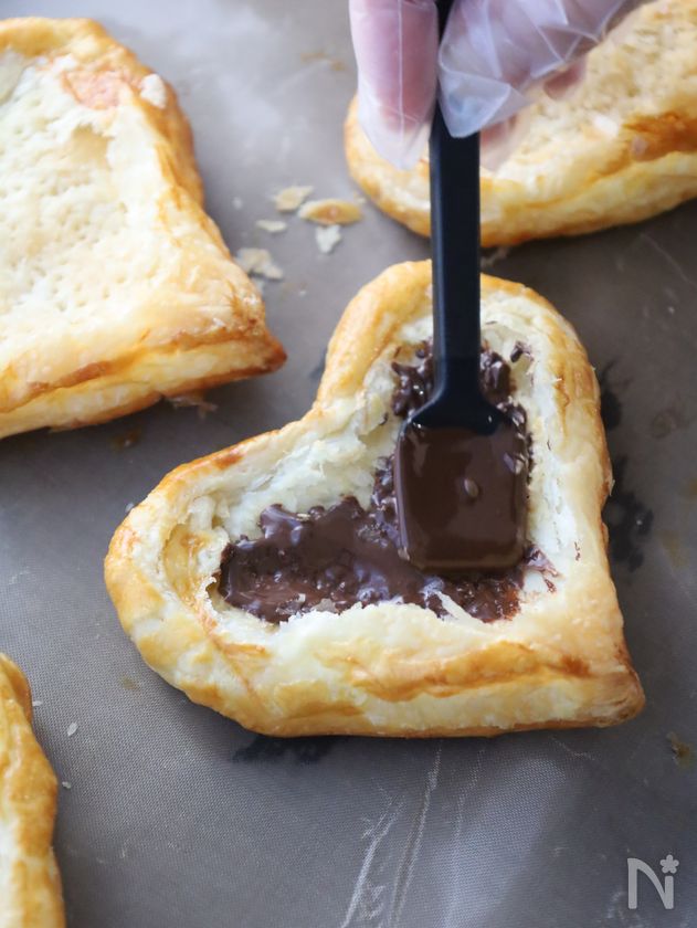 (8) チョコレートを溶かし、中央部分に薄くぬり広げておく。