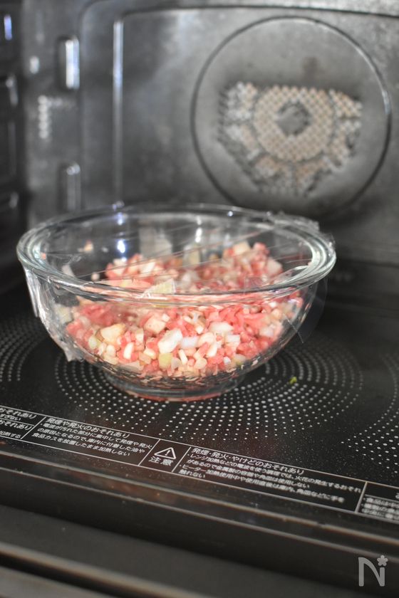 (2) 耐熱容器に合いびき肉、エリンギ、玉ねぎを入れてざっと和える。ふんわりとラップをかけて電子レンジ(600W)で4分ほど加熱する。