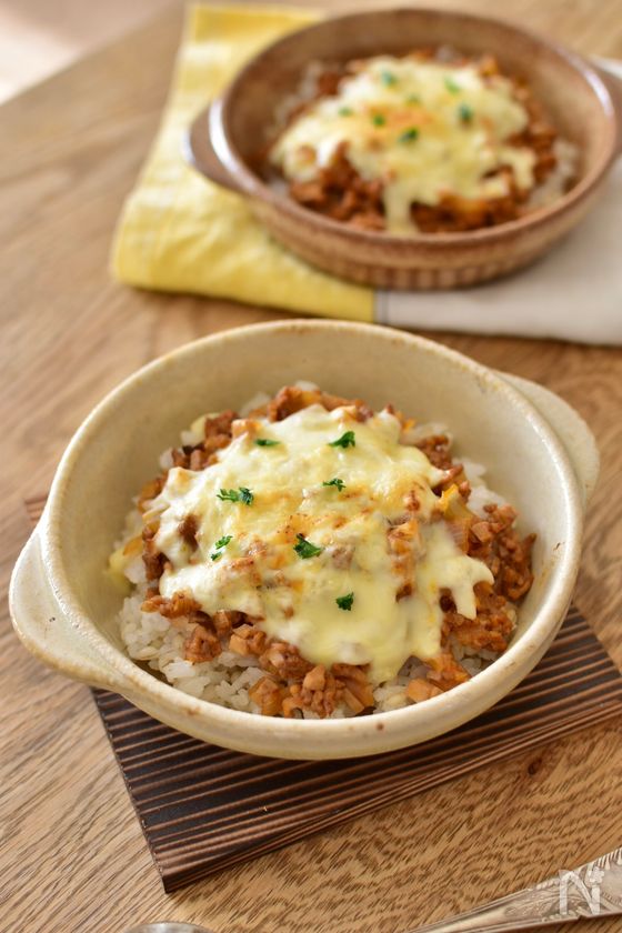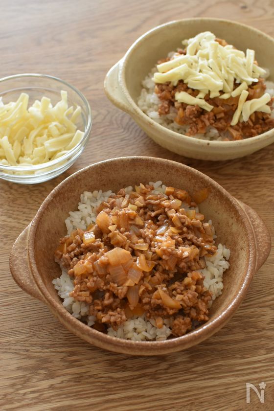 (4) 3を半量ずつご飯の上に広げ、ピザ用チーズをのせる。