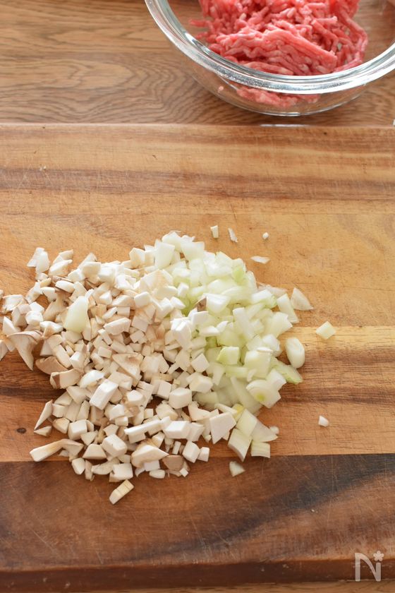 (1) 玉ねぎ、エリンギはみじん切りにする。