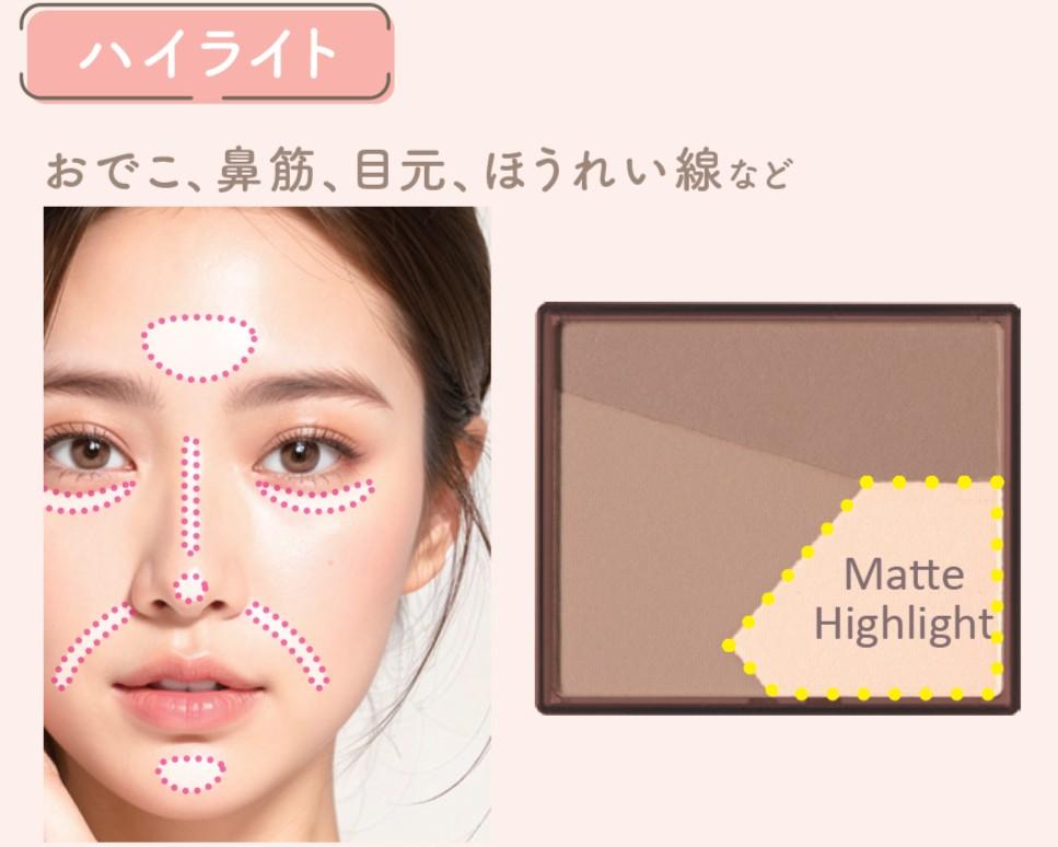 ハイライトは、目の下・ほうれい線・口元など高さを出したい部分に。